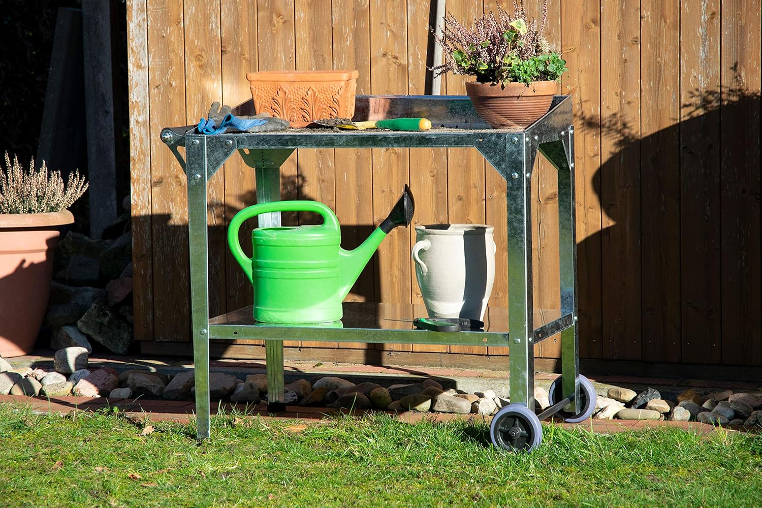 Der rollbare Gärtnertisch “Wagon” ist ein vielseitiger und robuster Arbeitsplatz für die Gartenarbeit. Der Pflanztisch besteht aus verzinkten Metallteilen (Stärke: 0,6 – 1,0 mm), die eine hohe Stabilität und Wetterfestigkeit garantieren.