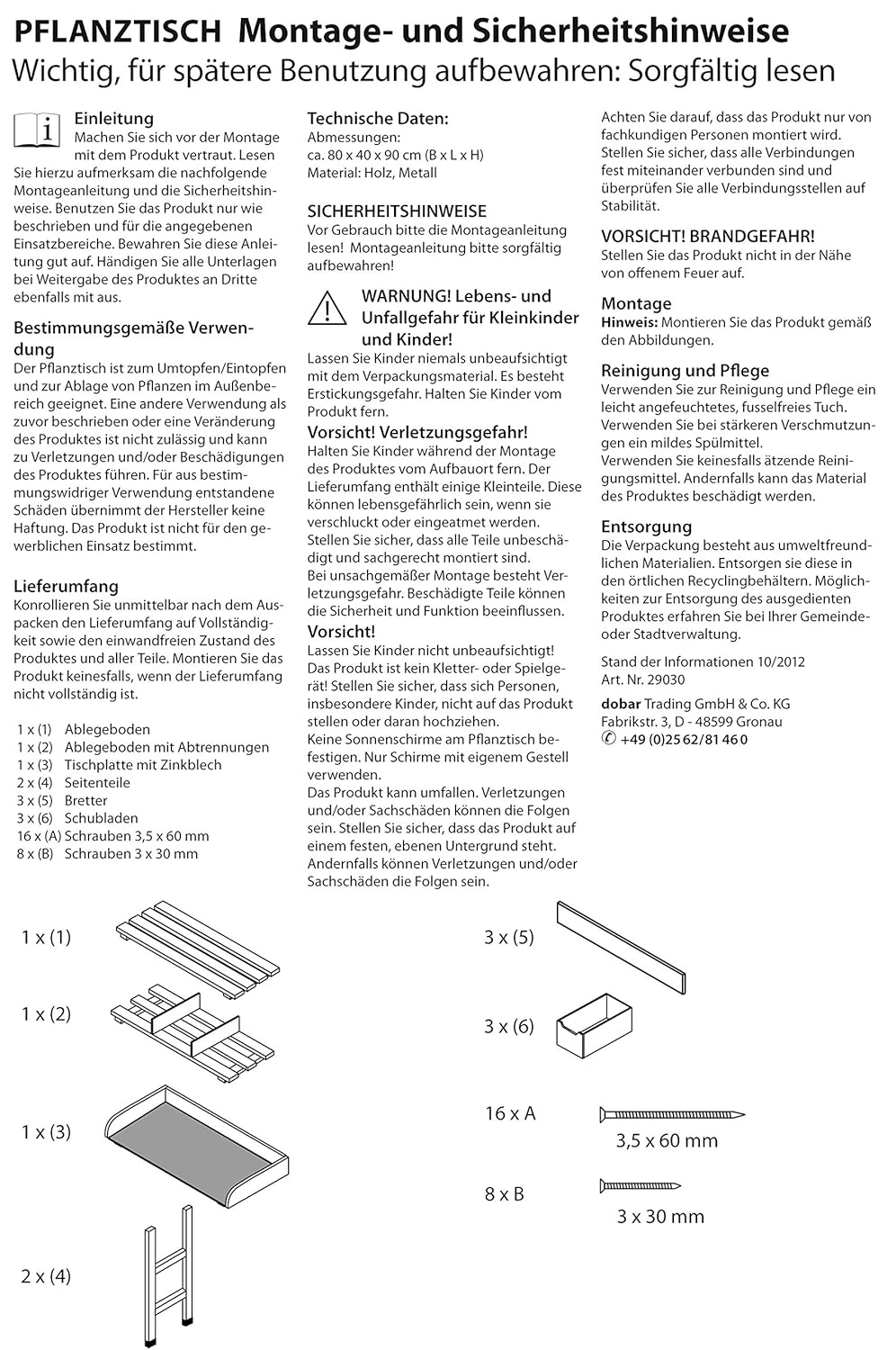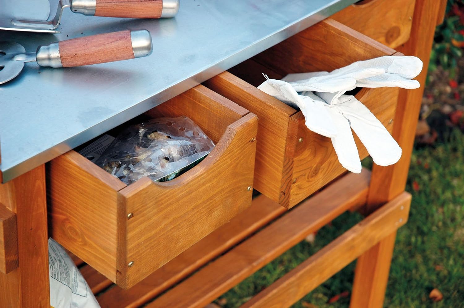 Dieser hilfreiche Pflanztisch erleichtert die Gartenarbeit, z.B. beim Umtopfen, enorm. Die Arbeitshöhe von ca. 85 cm ist besonders knie- und rückenschonend und dank der integrierten Schubladen und dem Ablageboden haben sie Ihre Gartenwerkzeuge immer griffbereit. Die verzinkte Arbeitsfläche ist ca. 80 x 40 cm groß und von einer Umrandung umgeben, die mehrere Einkerbungen aufweist, in denen Gartengeräte abgelegt werden können. Der Pflanztisch besteht aus wetterfest imprägniertem Kiefernholz und hat Kunststoffkappen an den Füßen, die das Holz vor Bodenfeuchte schützen.